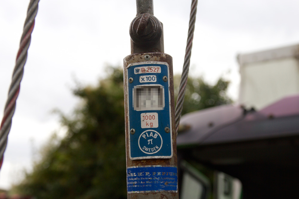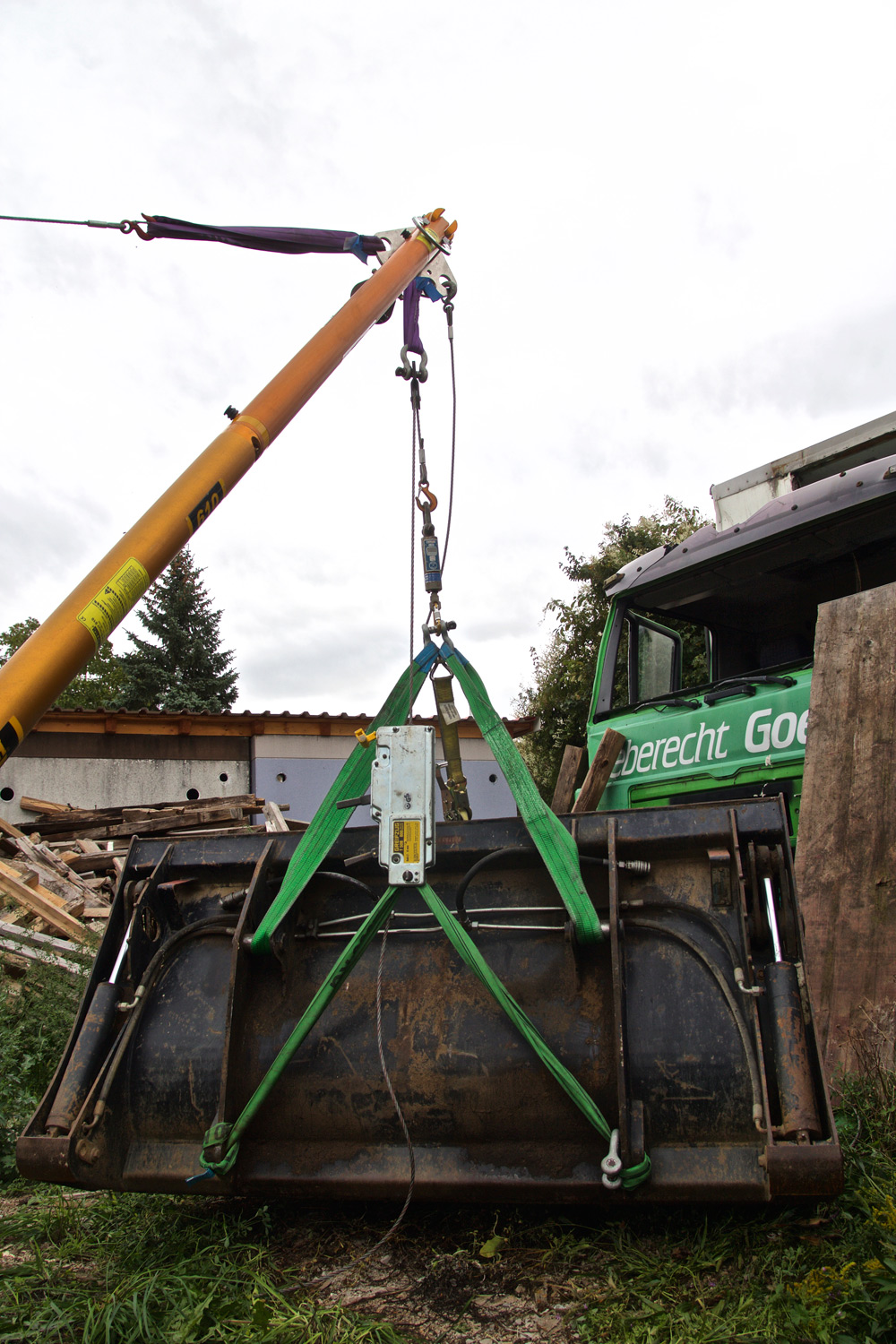 Das Gewicht der Schaufel schätze ich auf 250 kg. Zusätzlich hängen noch ca. 50 kg (Anschlagmaterial + Mehrzweckzug) am Zweibein, also zusammen etwa 300 Kilogramm.