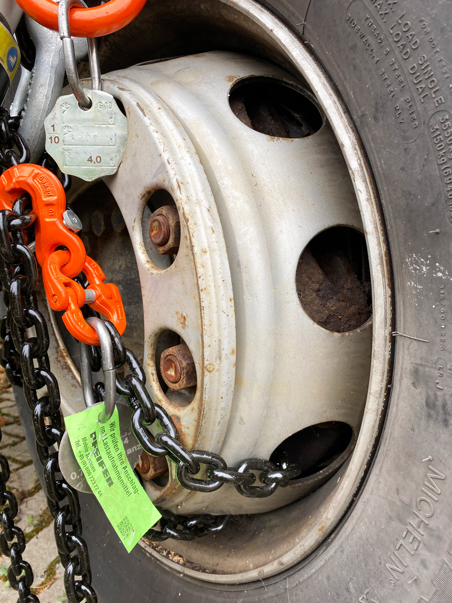 Wir haben uns für eine Lösung mit unserem Gerätesatz „ZIEHEN“ 5t (mit zusätzlicher Kranzkette, oder zweitem Satz ZIEHEN) entschieden indem die Kranzketten durch die Felgenlöcher gefädelt wurden.