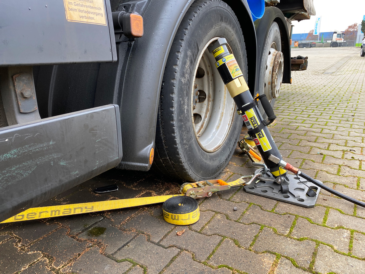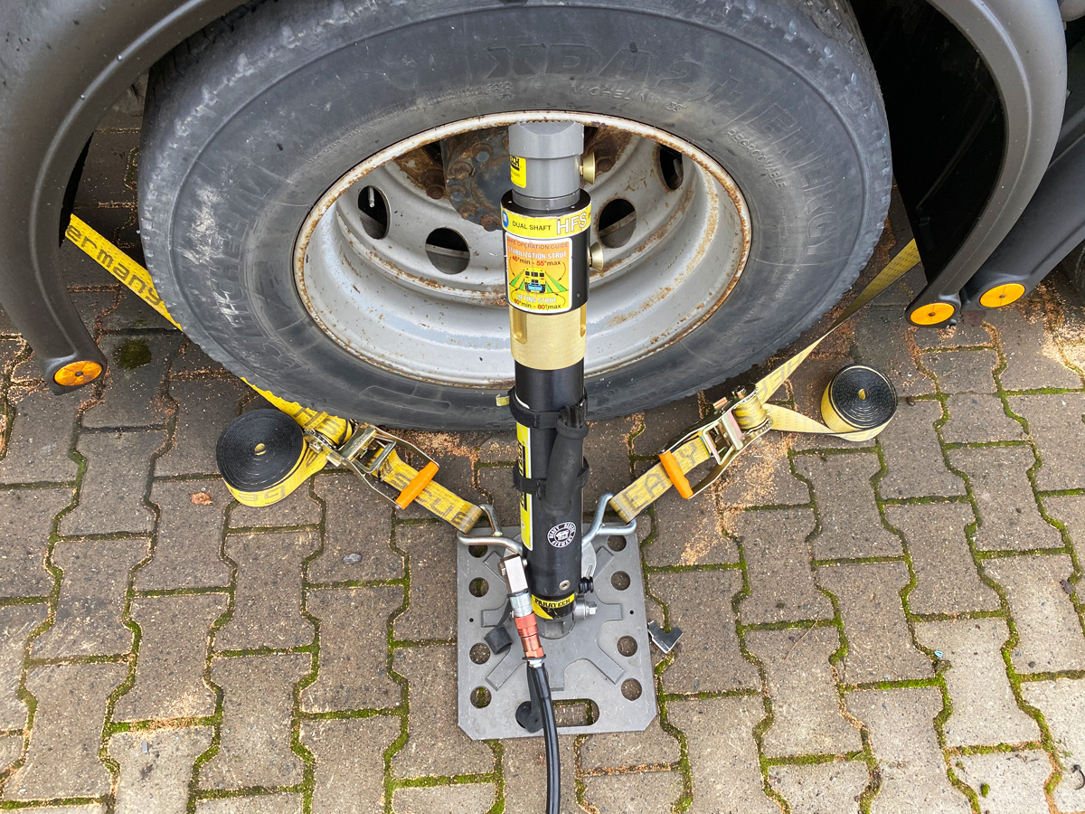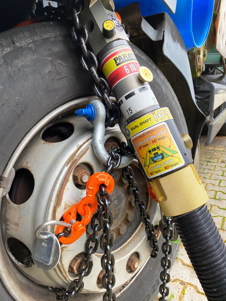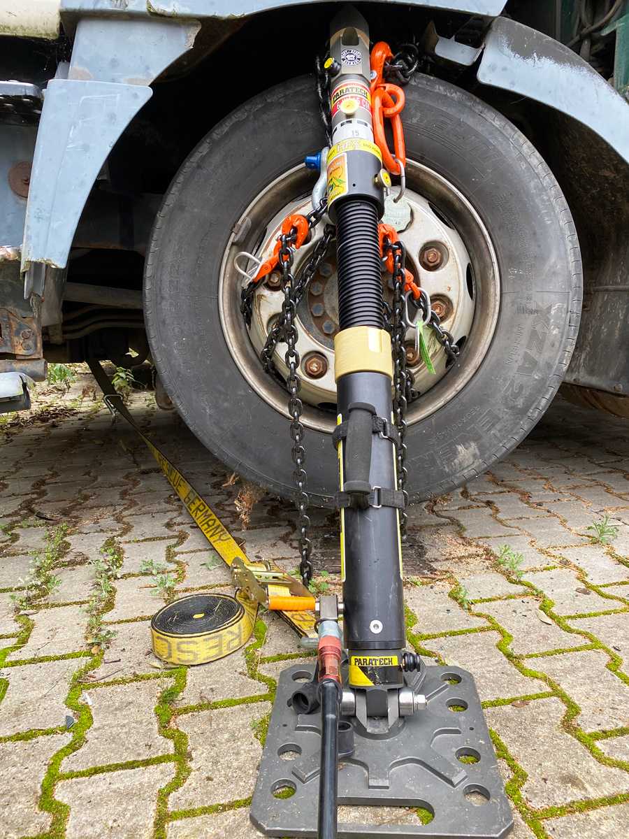 Darauf hin kamen vermehrt Anfragen, ob man es nicht auch mit dem hydraulischen Heber „HFS“ von Paratech (HFS 10, Hubkraft max. 9t) und geeigneten Anschlagmittel könnte.
