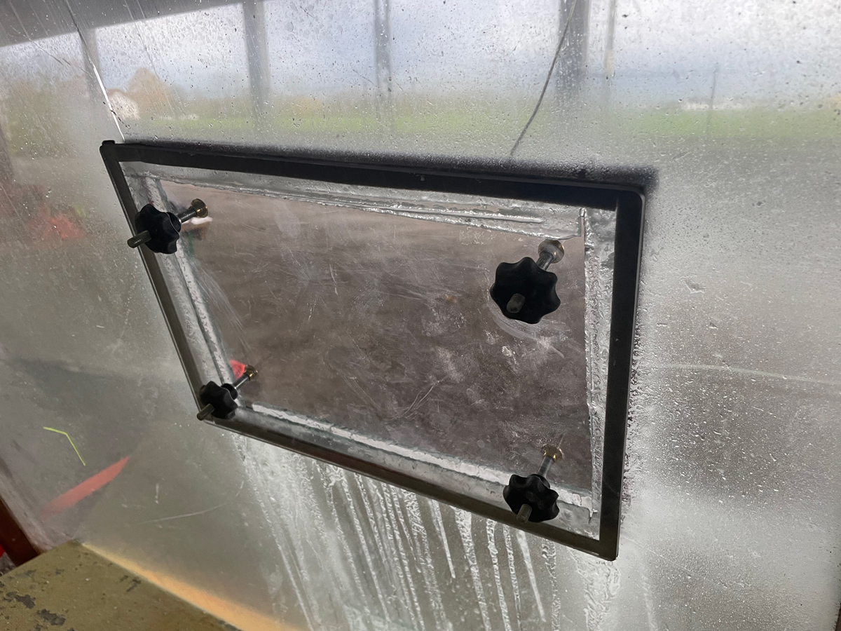 Anschließend wird die Öffnung mit dem Verschluß wieder gesichert. Auf der Außenseite wird die Kunststoffscheibe mit doppelseitigem Klebeband fixiert, und mit den vier Schrauben auf der Innenseite versehen. Hier muss man gerade bei großen Fenstern darauf achten dass diese nicht zu fest zusammengezogen werden, ansonsten zerpsringen die Scheiben leicht (im Bild gut zu sehen).